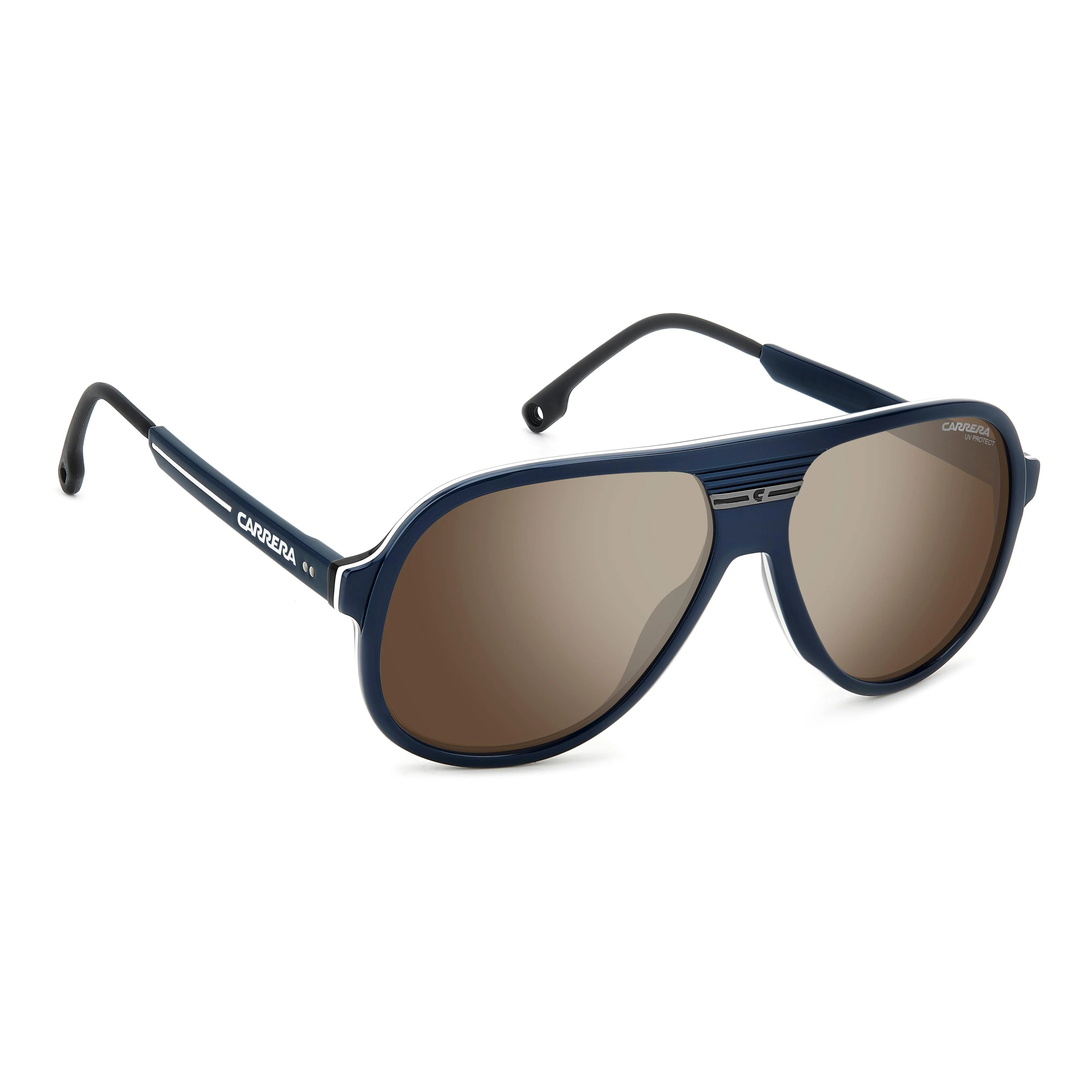 Carrera looks to its archives with these sunglasses creating a sporty but always fashionable style. Their aviator front is iconic, made even more decisive by a horizontal logo. The multilayer versions are undeniably cool, and the lenses come in mirrored or polarized options for extra protection on roads or under the lights of a party.